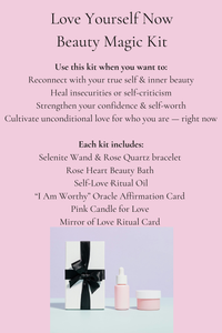 The Love Yourself Now Beauty Magic Kit is a deeply nurturing ritual experience that reconnects you to your self-worth, beauty, and emotional softness. It was designed to heal the parts of you that crave approval, dissolve insecurities, and awaken a radiant self-love that glows from within.