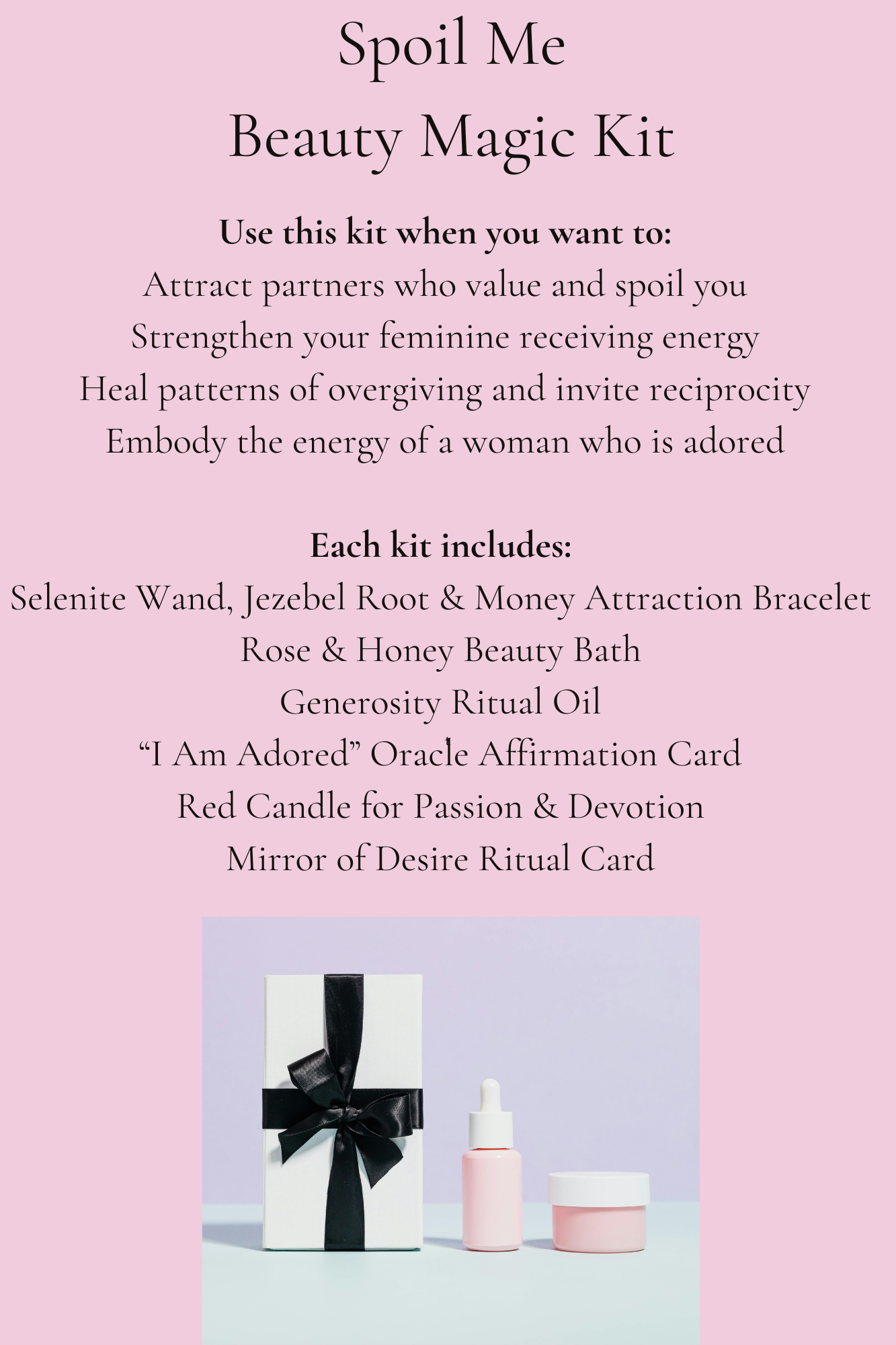 Love should feel easy, generous, and divine. The Spoil Me Beauty Magic Kit helps you call in a partner who adores you, invests in you, and cherishes your energy. This kit was created to align your aura with high-value romantic energy — love that uplifts, supports, and celebrates your beauty.