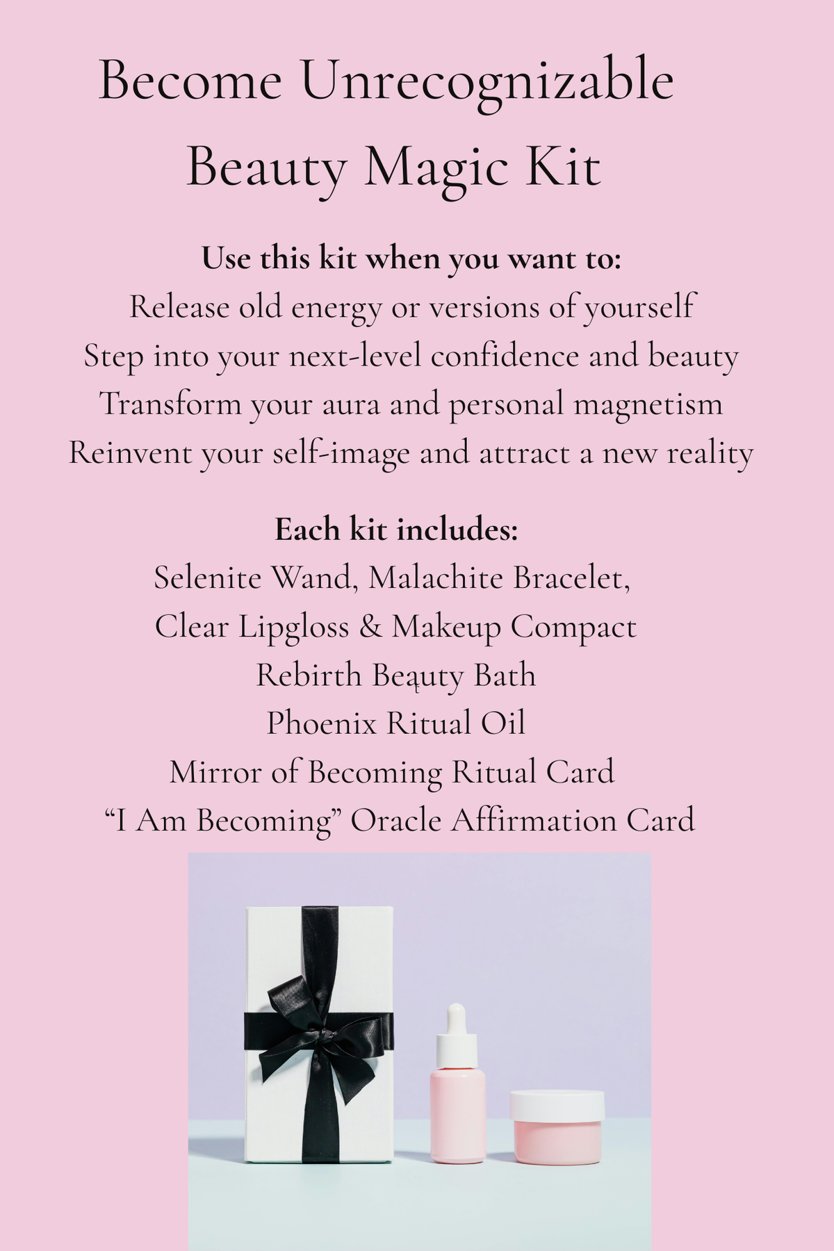 When it’s time to evolve beyond who you’ve been — this is your ritual of rebirth. The Become Unrecognizable Beauty Magic Kit is a full energetic and aesthetic transformation spell designed to help you release the old version of yourself and emerge as your most magnetic, elevated, and luminous self yet.